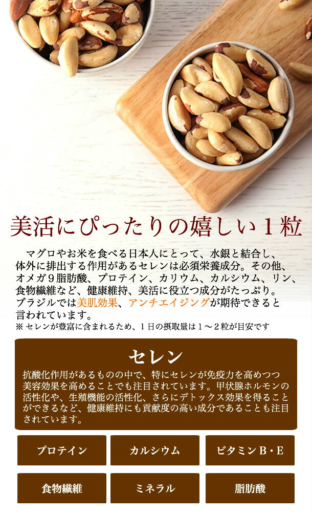 商品コード:1001 生産国:ブラジル 輸入社:株式会社DEL SOL 内容量:100g(30粒程度) 1日の摂取量:1〜2粒商品詳細名称 ブラジルナッツ カスターニャ・ド・パラ 豊富なプロテイン アマゾンのスーパーナッツ ナッツ 美肌 美活 美容 潤い セレニュウム セレン ナッツ 若返り オメガ9 ニンニク 抗酸化作用 アマゾン 脂肪酸 飽和脂肪酸原材料名ブラジルナッツ 無添加 無塩内容量100g賞味期限1年保存方法密閉容器で常温保存。