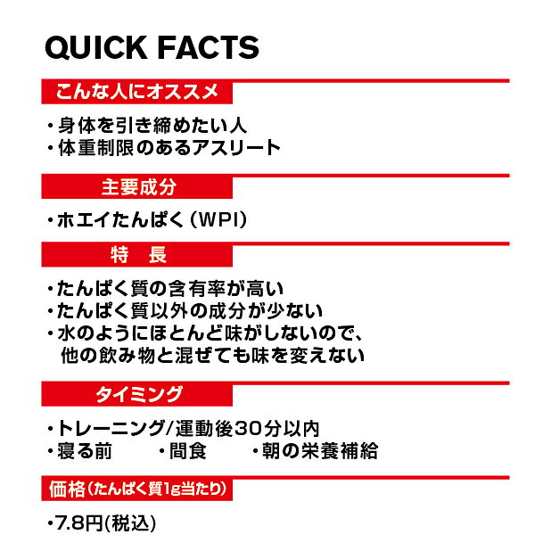 【推奨タイミング】 ・トレーニング/運動後30分以内 ・寝る前 ・間食 ・朝の栄養補給 栄養成分表示【1食(25g)あたり】 エネルギー:94kcal、たんぱく質:23.1g(無水物換算値:24.4g)、脂質:0.1g、炭水化物:0.1g、食塩相当量:0.4g 原材料名 ホエイたんぱく(乳成分を含む)/乳化剤、増粘剤(グァーガム) ※遺伝子組み換え作物(GMO)を使用していません。