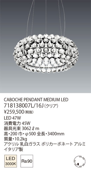 ●型番:718138007L-16J ●品名:718138007L/16J CABOCHE PENDANT MEDIUM LED ●メーカー:ヤマギワ ●ランプ:LED 47W(3000K) ●消費電力:45W ●器具光束:3062?m ●寸法:高・200 巾・φ500 全長・3400mm 質量・10.2kg ●材質・仕上:アクリル 乳白ガラス ポリカーボネート アルミ ●国名:イタリア製 ●デザイナー:Patricia Urquiola & Eliana Gerotto ●特記事項:※LEDの光色・明るさには若干の個体差があります メーカー希望小売価格はメーカーサイトに基づいて掲載しています