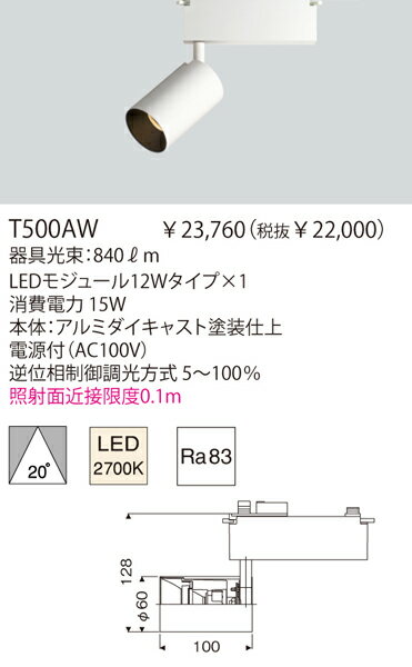 ●型番:T500AW ●品名:GEM 60SPOT ●メーカー:ヤマギワ ●ランプ:LED 高出力 電球色タイプ(2700K) ●消費電力:15W ●器具光束:840lm ●寸法:巾・φ60 奥・100(+電源ユニット) 高・128mm ●材質・仕上:本体:アルミダイキャスト塗装仕上 ●近接限度距離:照射面近接限度 0.1m ●インバータ:電源ユニット付 ●特記事項:20°配光タイプ ●特記事項:平均演色評価数 83 ●特記事項: ●特記事項:(100V) 逆位相制御調光方式 5〜100% ●特記事項: ●特記事項:LEDの発光・明るさにはばらつきがあります。