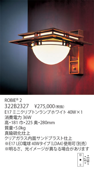 ●型番:322B2327 ●品名:ROBIE 2(ロビー)/(タリアセン/Frank Lloyd Wright(フランクロイドライト) ●メーカー:ヤマギワ ●ランプ:E17 ミニクリプトンランプホワイト 40W×1 ●消費電力:36W ●寸法:高・181 巾・225 奥・280mm 質量・5.0kg ●材質・仕上:真鍮硫化仕上 クリアガラス内面サンドブラスト仕上 ●デザイナー:Frank Lloyd Wright? ●特記事項:※E17 LED電球 40Wタイプ(LDA4)使用可(別売) ●特記事項:※明るさ、光イメージが異なる場合があります メーカー希望小売価格はメーカーサイトに基づいて掲載しています