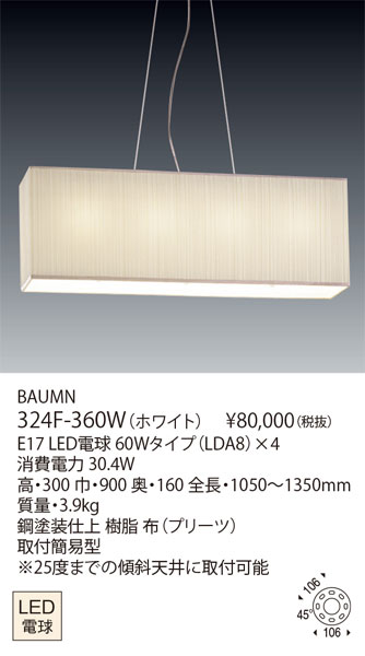 ●型番:324F-360W ●品名:BAUMN(バウム) ●メーカー:ヤマギワ ●ランプ:E17 LED電球 60Wタイプ(LDA8)×4 ●消費電力:30.4W ●寸法:高・300 巾・900 奥・160 全長・1050〜1350mm 質量・3.9kg ●材質・仕上:鋼塗装仕上 樹脂 布(プリーツ) ●特記事項:取付簡易型 ●特記事項:※25度までの傾斜天井に取付可能メーカー希望小売価格はメーカーサイトに基づいて掲載しています