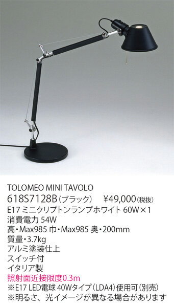 ●型番:618S7128B ●品名:TOLOMEO MINI TAVOLO ●メーカー:ヤマギワ ●ランプ:E17 ミニクリプトンランプホワイト 60W×1 ●消費電力:54W ●寸法:高・Max985 巾・Max985 奥・200mm 質量・3.7kg ●材質・仕上:アルミ塗装仕上 ●近接限度距離:照射面近接限度0.3m ●国名:イタリア製 ●デザイナー:Michele De Lucchi & Giancarlo Fassina ●特記事項:スイッチ付 ●特記事項:※E17 LED電球 40Wタイプ(LDA4)使用可(別売) ●特記事項:※明るさ、光イメージが異なる場合があります メーカー希望小売価格はメーカーサイトに基づいて掲載しています
