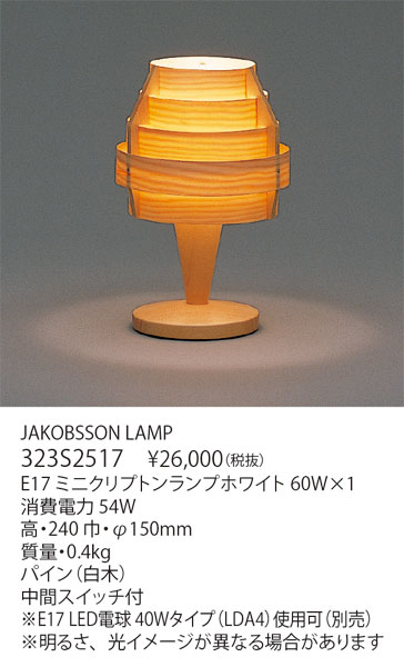 ●型番:323S2517 ●品名:JAKOBSSON LAMP/(ヤコブソンランプ) ●メーカー:ヤマギワ ●ランプ:E17 ミニクリプトンランプホワイト 60W×1 ●消費電力:54W ●寸法:高・240 巾・φ150mm 質量・0.4kg ●材質・仕上:パイン(白木) ●デザイナー:Hans-Agne Jakobsson ●特記事項:中間スイッチ付 ●特記事項:※E17 LED電球 40Wタイプ(LDA4)使用可(別売) ●特記事項:※明るさ、光イメージが異なる場合があります ●特記事項:※天然素材を使用しているため、木目や色が多少異なることがあります メーカー希望小売価格はメーカーサイトに基づいて掲載しています
