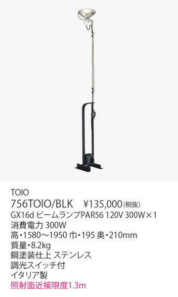 ●型番:756TOIO/BLK ●品名:TOIO ●メーカー:ヤマギワ ●ランプ:GX16d ビームランプPAR56 120V300W×1 ●消費電力:300W ●寸法:高・1580〜1950 巾・195 奥・210mm 質量・8.2kg ●材質・仕上:鋼塗装仕上 ステンレス ●近接限度距離:照射面近接限度1.3m ●国名:イタリア製 ●デザイナー:Achille Castiglioni/P. G. Castiglioni ●特記事項:調光スイッチ付 メーカー希望小売価格はメーカーサイトに基づいて掲載しています