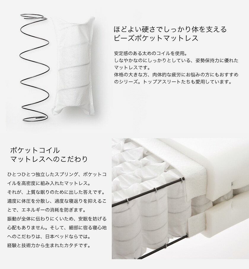 日本ベッド マットレス 選べる硬さ ビーズポケットマットレス シングル 硬め/ふつう/柔らかめ ポケットコイルマットレス 国産 メーカー保証付 抗菌防臭 体圧分散 理想の寝姿勢 エッジサポート 正規販売店 送料無料