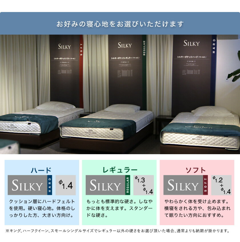 ▼ 国産メーカー「日本ベッド」のモノづくりとは ▼ サイズ別リンク シルキーポケット(ウール入) セミシングル80 セミシングル90 シングル セミダブル ダブル クイーン キング Mattress Link